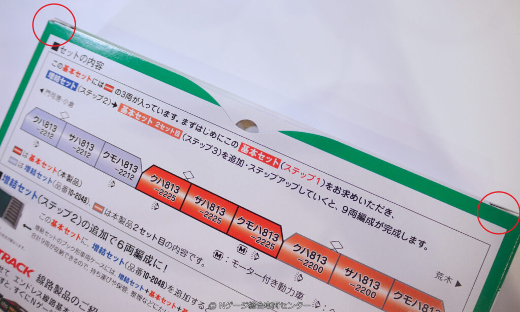 TOMIXもそうですが、このような基本セットは増結セットのブックケースに収納する前提でこのような紙製パッケージが採用されているわけですが、若年層の入門セットとしては良いのかもしれませんが・・・、個人的にはチープ感が否めない(それなりのお値段なので、ある程度高級感は出してほしい)のと、紙製ゆえに取り扱いに難あり(開封・収納時にボロボロになりやすい)のため、私はあまり好みではないのです・・・(そんなことはどうでも良いという方も多いでしょうが^^)