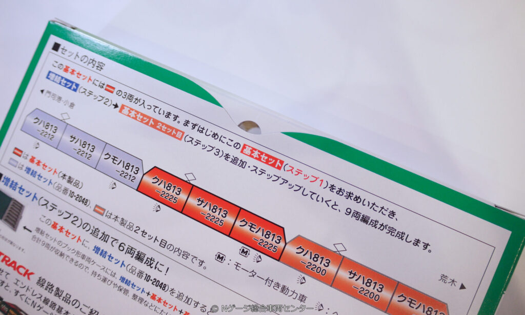 スターターセット的な感じで各種説明がされています。こちらの編成図では、門司港・小倉方面からRM2212編成+RM2225編成とされていますが、同封の説明書内の6両編成の場合は、M車が編成中間にくるように、門司港・小倉方面からRM2225編成+RM2212編成とされています。