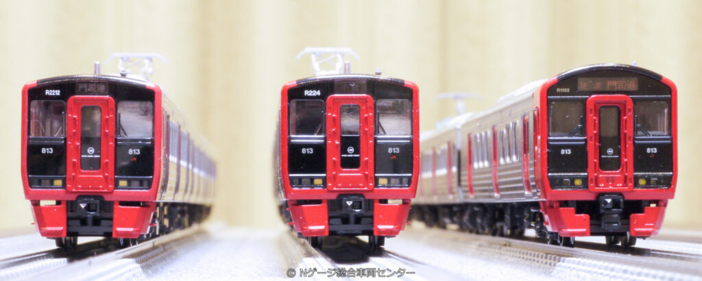 左から、下り方(久留米・荒尾方面)先頭車の、RM2212編成(クモハ813-2212:KATO)、RM224編成(クモハ813-224:KATO)、RM1102編成(クハ812-1102:ポポンデッタ)です。
